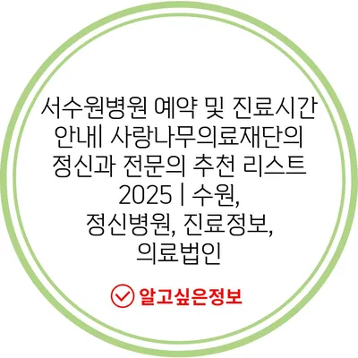 서수원병원 예약 및 진료시간 공지| 사랑나무의료재단의 정신과 전연락 추천 리스트 2025 | 수원, 정신병원, 진료정보, 의료법인에 대해 자주 묻는 질문 TOP 5